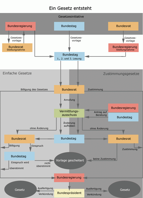 Damit wird ein Verfahren in Gang gesetzt, das die ursprüngliche Gesetzesidee zu Gesetzestexten formuliert und anschließend durch Abstimmung im Bundestag und Bundesrat verabschiedet wird. Mit der Unterschrift des Bundespräsidenten wird das Gesetz ausgefertigt und im Bundesgesetzblatt verkündet.