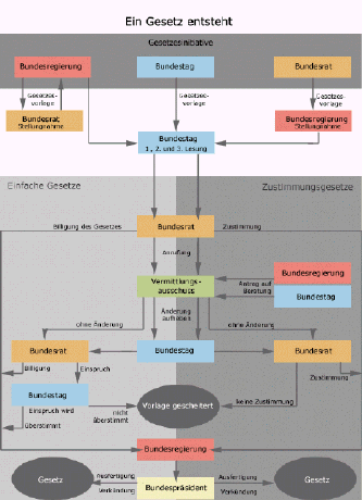 Man unterscheidet "Einspruchsgesetze" und "Zustimmungsgesetze". Ein "Einspruchsgesetz" ist nicht von der Zustimmung der Länderkammer, dem Bundesrat, abhängig. Nur der Bundestag muss den Entwurf annehmen. Gleichwohl ist der Bundesrat am Gesetzgebungsverfahren beteiligt. Legt er Einspruch gegen ein Gesetz ein, kann dieser vom Bundestag überstimmt werden "Zustimmungsgesetze" müssen sowohl vom Bundestag als auch vom Bundesrat beschlossen werden. Die Zuständigkeit, welches Verfahren für welches Gesetz notwendig ist, ergibt sich aus dem Grundgesetz. Hiernach sind die meisten Gesetze, insbesondere Gesetze über Steuern, die Bund und Ländern gemeinsam zustehen (z.B. Einkommen-, Körperschaft- und Umsatzsteuer), zustimmungsbedürftig."